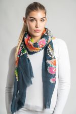 Sciarpa ricamata a mano su fondo blu petrolio, decorata con grandi fiori nei toni arancio e fucsia, accompagnati da foglie in verde lime e dettagli a contrasto ricamati punto per punto. L’effetto è luminoso e vibrante, ma allo stesso tempo equilibrato grazie alla profondità del colore di base.