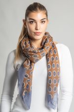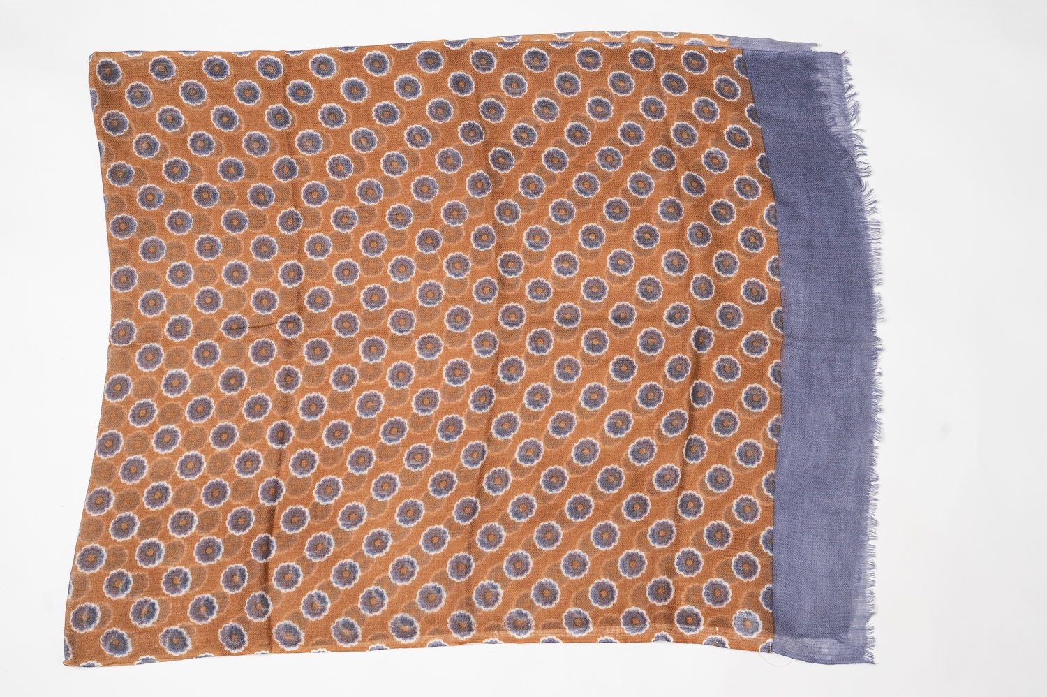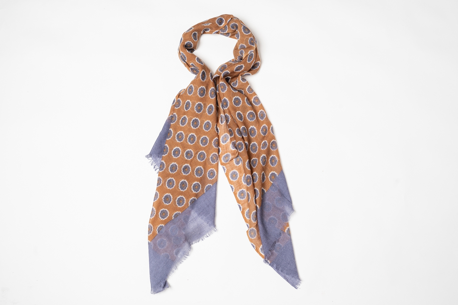 Sciarpa in lana con stampa geometrica su fondo senape dorato, con piccoli motivi rotondi nei toni blu notte e avorio. Il bordo laterale in grigio perla / azzurro polvere aggiunge un contrasto raffinato che rende l’accessorio distintivo ma sempre facile da abbinare.