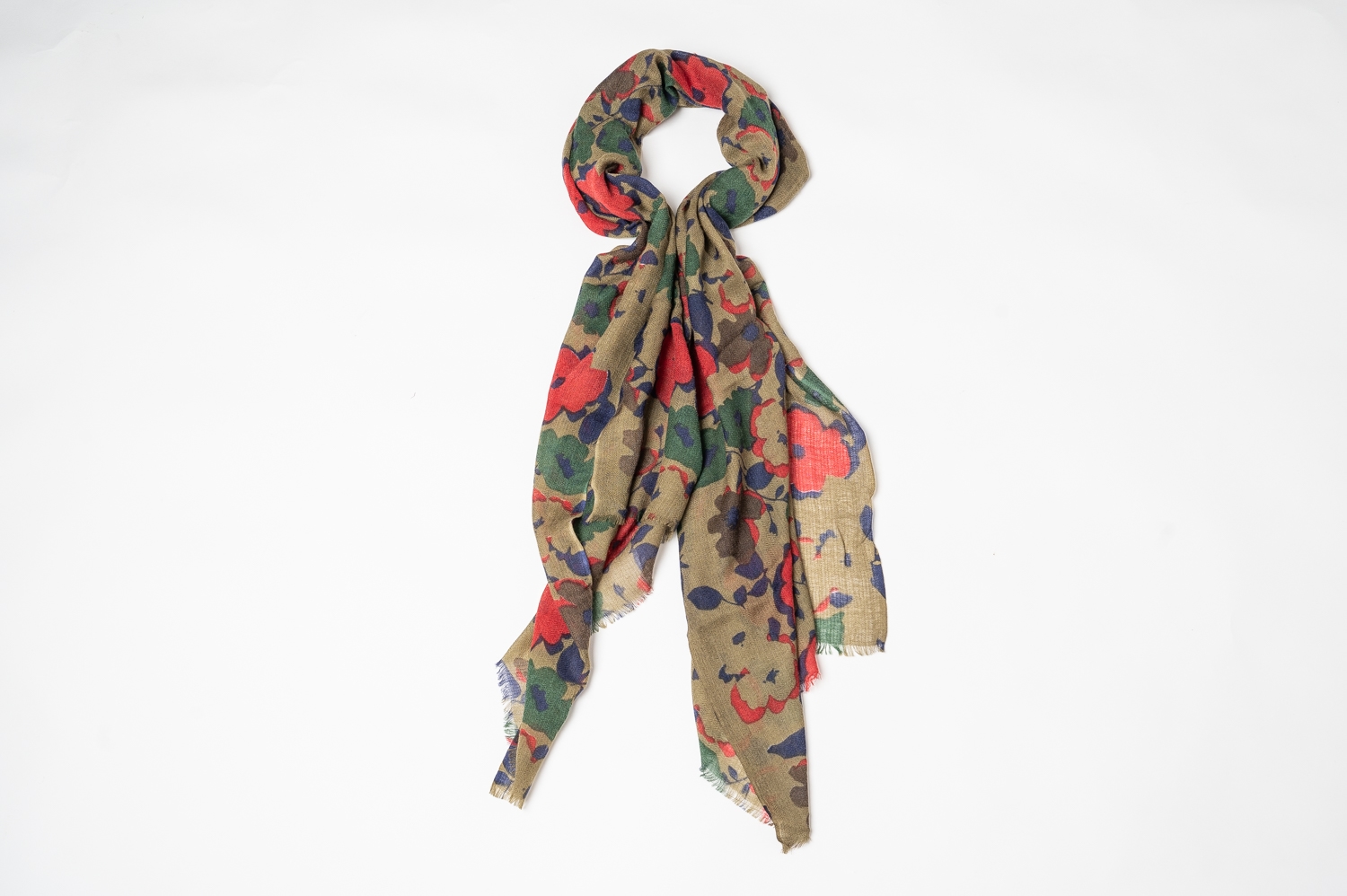 Sciarpa in lana con stampa floreale su fondo sabbia dorata, con fiori nei toni rosso corallo, verde oliva e blu notte. Il disegno crea un effetto caldo e armonioso, ideale per illuminare cappotti e maglieria nei colori neutri o scuri.