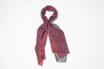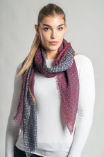 Sciarpa in lana con stampa micro-geometrica su fondo bordeaux, con motivi nei toni blu notte e senape. La parte inferiore presenta una fascia blu con disegno incrociato e profilo senape, che crea un elegante contrasto grafico. Un accessorio raffinato, adatto sia a look quotidiani che più curati.