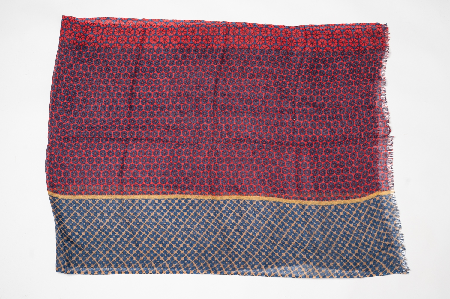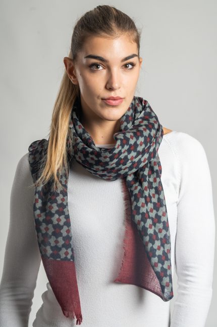 Sciarpa in lana con stampa micro-geometrica su fondo bordeaux, con motivi nei toni blu notte e senape. La parte inferiore presenta una fascia blu con disegno incrociato e profilo senape, che crea un elegante contrasto grafico. Un accessorio raffinato, adatto sia a look quotidiani che più curati.