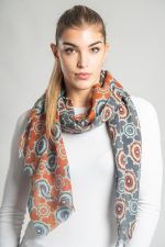 Sciarpa in lana con stampa bicolore: una metà su fondo grigio antracite con motivi circolari nei toni avorio, bordeaux e azzurro, l’altra metà su fondo arancio bruciato con la stessa fantasia ripresa in chiave più luminosa. L’alternanza dei due fondi permette di cambiare effetto semplicemente variando come la sciarpa viene avvolta.