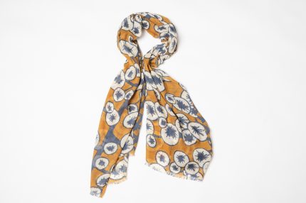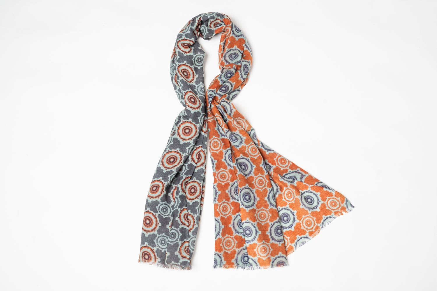 Sciarpa in lana con stampa bicolore: una metà su fondo grigio antracite con motivi circolari nei toni avorio, bordeaux e azzurro, l’altra metà su fondo arancio bruciato con la stessa fantasia ripresa in chiave più luminosa. L’alternanza dei due fondi permette di cambiare effetto semplicemente variando come la sciarpa viene avvolta.