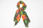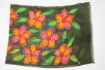 Sciarpa ricamata a mano su fondo verde oliva, decorata con fiori stilizzati nei toni arancio, magenta e giallo, accompagnati da foglie in verde smeraldo. I profili ricamati punto per punto donano luce e rilievo, rendendo il disegno vivo e armonioso.