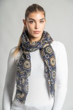 Sciarpa in lana con stampa geometrica nei toni blu notte, beige e grigio caldo. Il motivo a piccoli esagoni ripetuti crea un effetto raffinato e ordinato, perfetto per chi cerca un accessorio discreto ma di carattere. Facile da abbinare a cappotti blu, cammello, grigi o marroni.