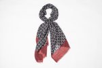 Sciarpa in lana con stampa micro-geometrica nei toni blu notte, grigio e bordeaux, con bordo laterale rosso mattone che dona un tocco di contrasto elegante e discreto. Il disegno fitto e regolare la rende facile da abbinare e perfetta per l’uso quotidiano.