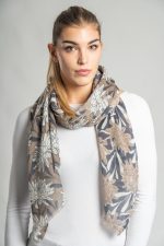 Sciarpa in lana con stampa floreale su fondo grigio fumo, con fiori stilizzati nei toni beige e avorio. Il disegno è armonioso e raffinato, ideale per chi ama un’eleganza sobria e facile da abbinare a cappotti chiari o scuri.