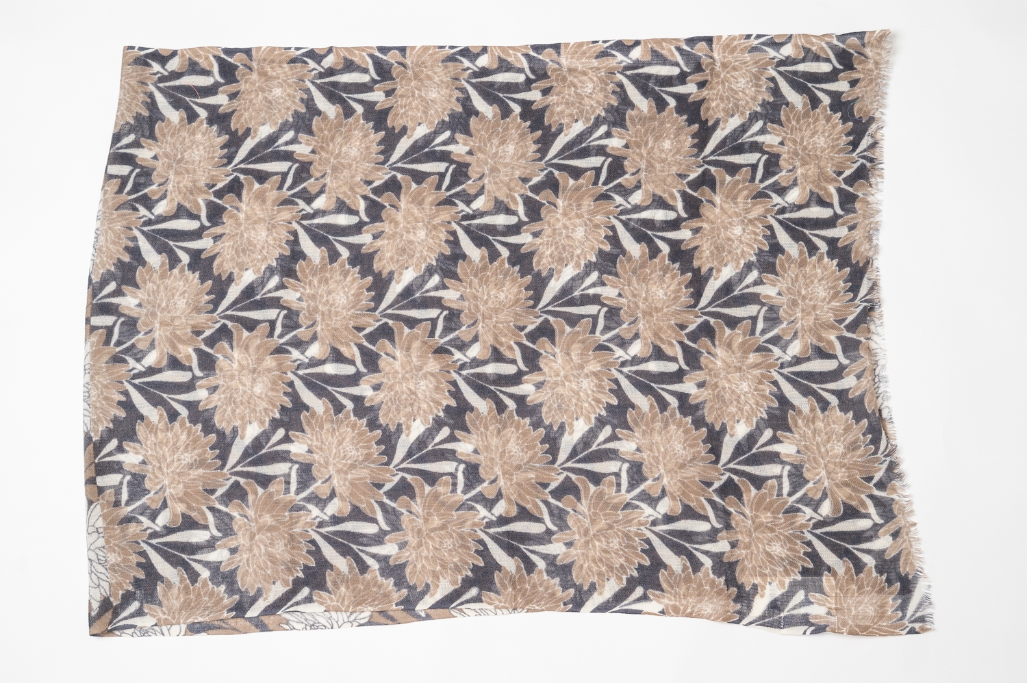 Sciarpa in lana con stampa floreale su fondo grigio fumo, con fiori stilizzati nei toni beige e avorio. Il disegno è armonioso e raffinato, ideale per chi ama un’eleganza sobria e facile da abbinare a cappotti chiari o scuri.