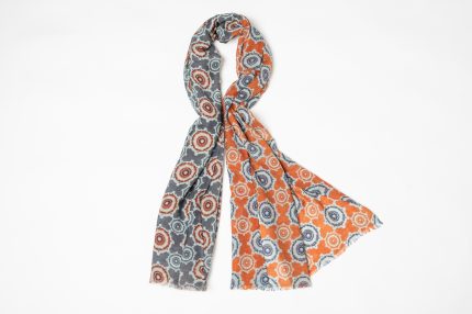 Sciarpa in lana con fantasia floreale stilizzata su fondo senape dorato, con fiori nei toni avorio, blu notte e grigio cenere. La parte superiore presenta un bordo a motivo geometrico che aggiunge equilibrio e carattere al disegno.