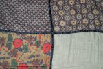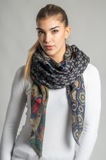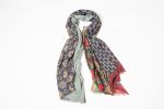 Una sciarpa patchwork dal carattere caldo e raffinato. Le diverse fantasie si alternano armoniosamente: un micro-disegno geometrico nei toni del grigio e vinaccia, un motivo grafico esagonale con accenti senape e blu, un floreale morbido con tocchi di rosso corallo e verde salvia, e una parte in tinta unita grigio chiaro che bilancia l’insieme.