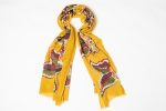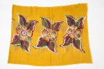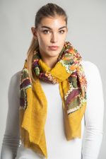 Sciarpa ricamata a mano su fondo giallo senape, decorata con grandi fiori stilizzati nei toni bordeaux, verde oliva, arancio e avorio. I profili ricamati punto per punto valorizzano il motivo e aggiungono luce, creando un effetto caldo e armonioso.