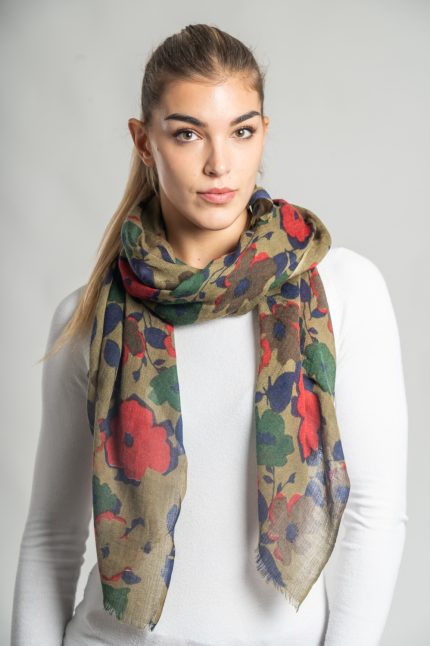 Sciarpa ricamata a mano su fondo giallo senape, decorata con grandi fiori stilizzati nei toni bordeaux, verde oliva, arancio e avorio. I profili ricamati punto per punto valorizzano il motivo e aggiungono luce, creando un effetto caldo e armonioso.