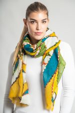 Sciarpa ricamata a mano su fondo giallo senape, caratterizzata da motivi astratti e linee ondulate nei toni turchese, blu petrolio, verde oliva e avorio, impreziositi da ricami colorati eseguiti punto per punto. Il disegno, dinamico e vibrante, richiama forme naturali e dona energia e luce all’outfit.