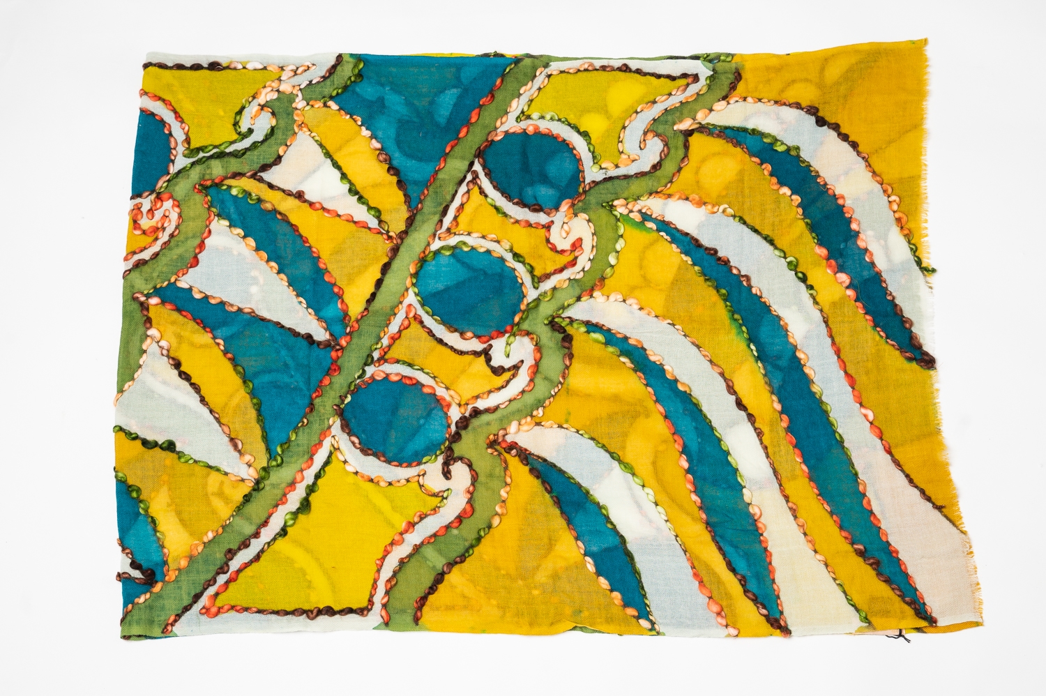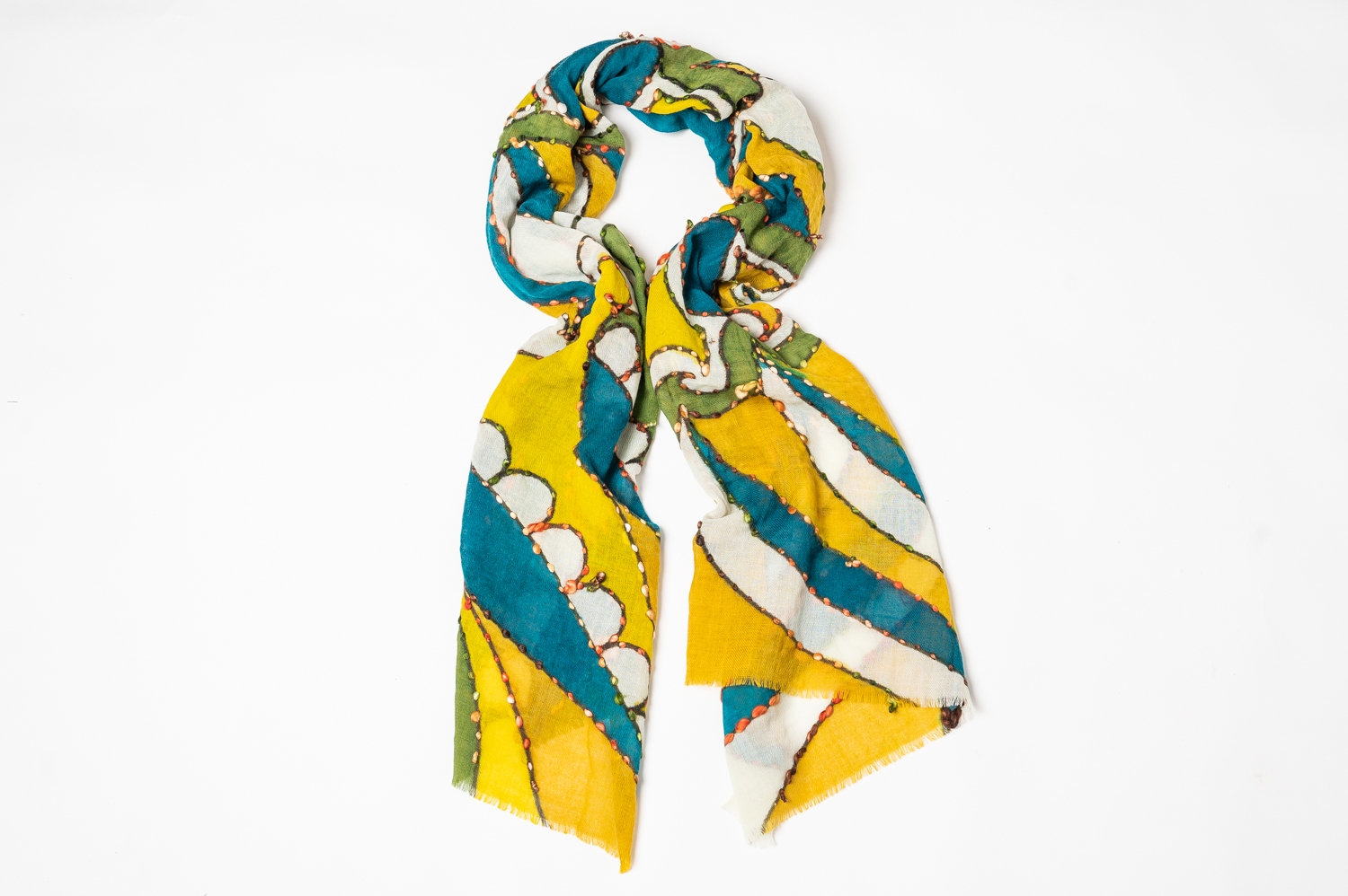 Sciarpa ricamata a mano su fondo giallo senape, caratterizzata da motivi astratti e linee ondulate nei toni turchese, blu petrolio, verde oliva e avorio, impreziositi da ricami colorati eseguiti punto per punto. Il disegno, dinamico e vibrante, richiama forme naturali e dona energia e luce all’outfit.