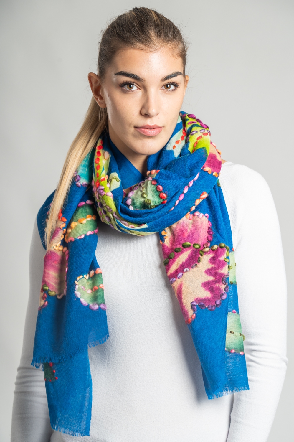 Sciarpa ricamata a mano su fondo blu cobalto, arricchita da grandi fiori stilizzati nei toni rosa, magenta, turchese, verde e giallo lime, con dettagli cuciti a mano che donano rilievo e luminosità. Il disegno è vivace e armonioso, capace di trasformare anche un look semplice in qualcosa di unico e pieno di personalità.